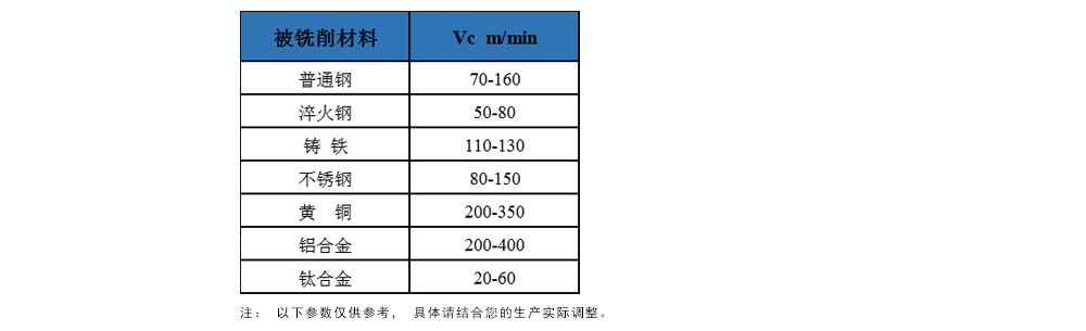 上表是几种不同被铣削材料的整体硬质合金锯片铣刀可选用的刀齿铣削线速度Vc(米/分钟)(m/min)范围,了解了铣刀的外径D(mm)及刀齿铣削线速度Vc,就可计算出铣刀轴的转速n(转/分钟):